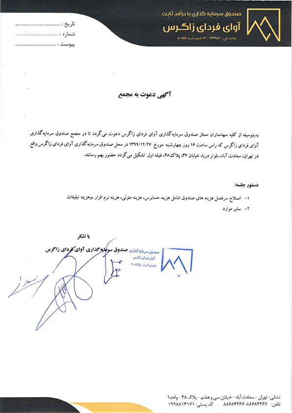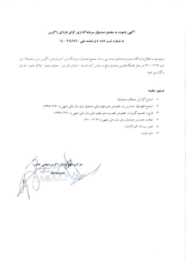 آگهی دعوت به مجمع صندوق سرمایه گذاری آوای فردای زاگرس مورخ ۱۴۰۰/۱۰/۰۶