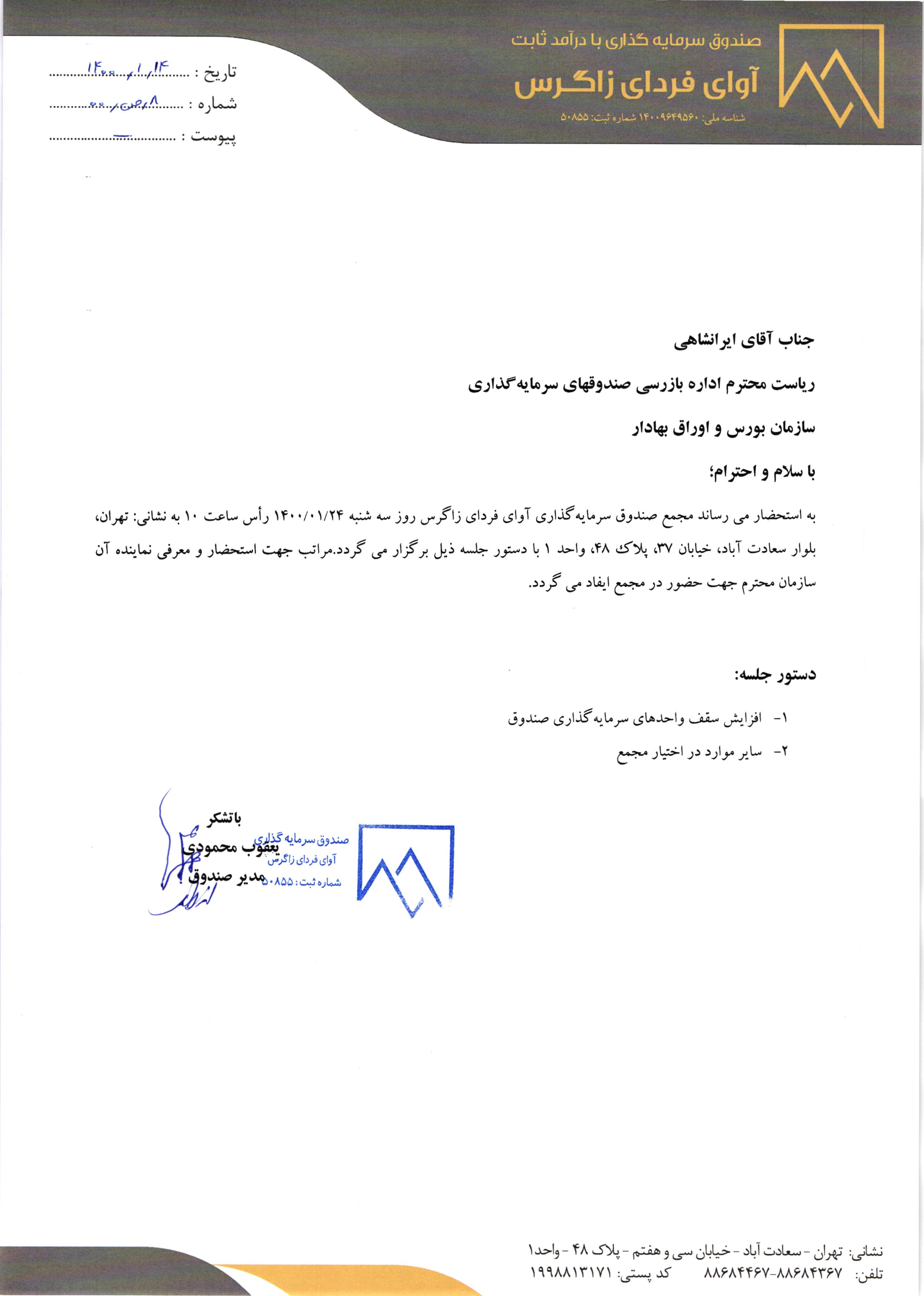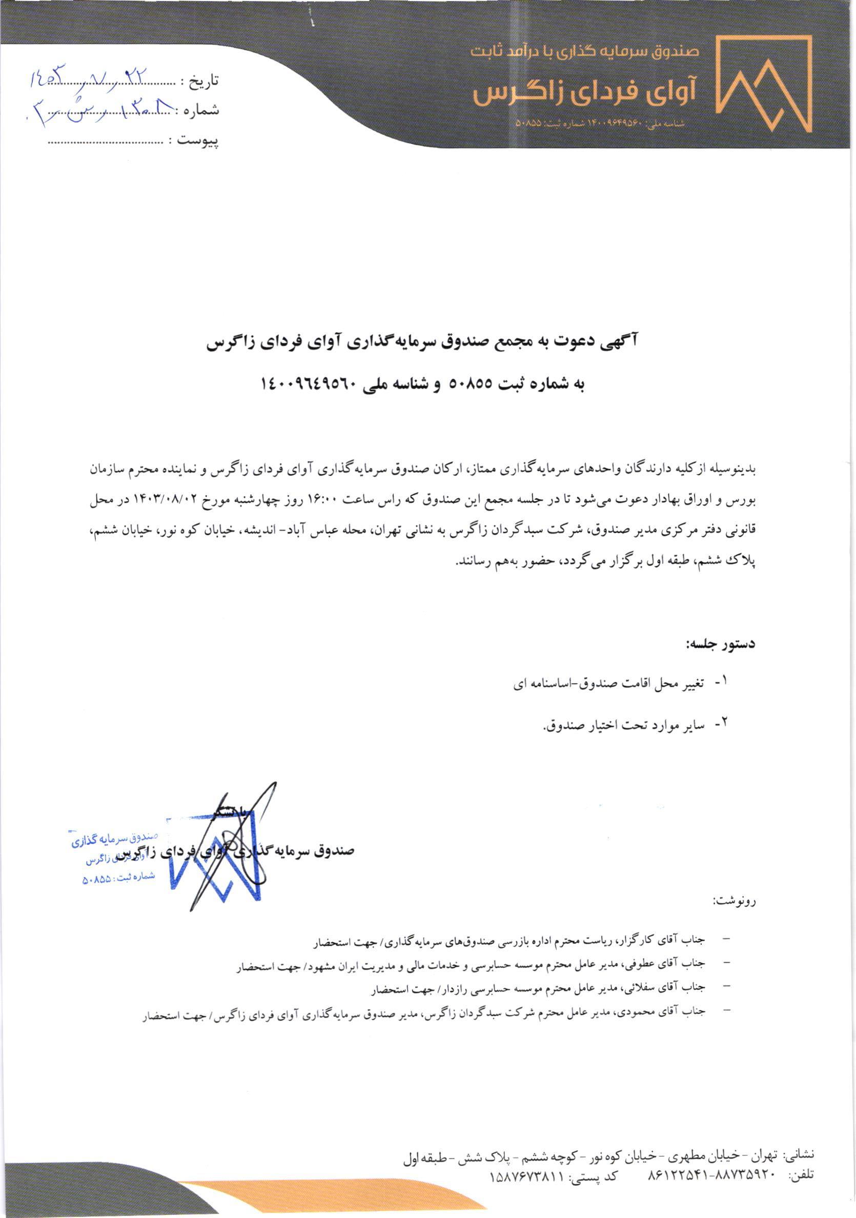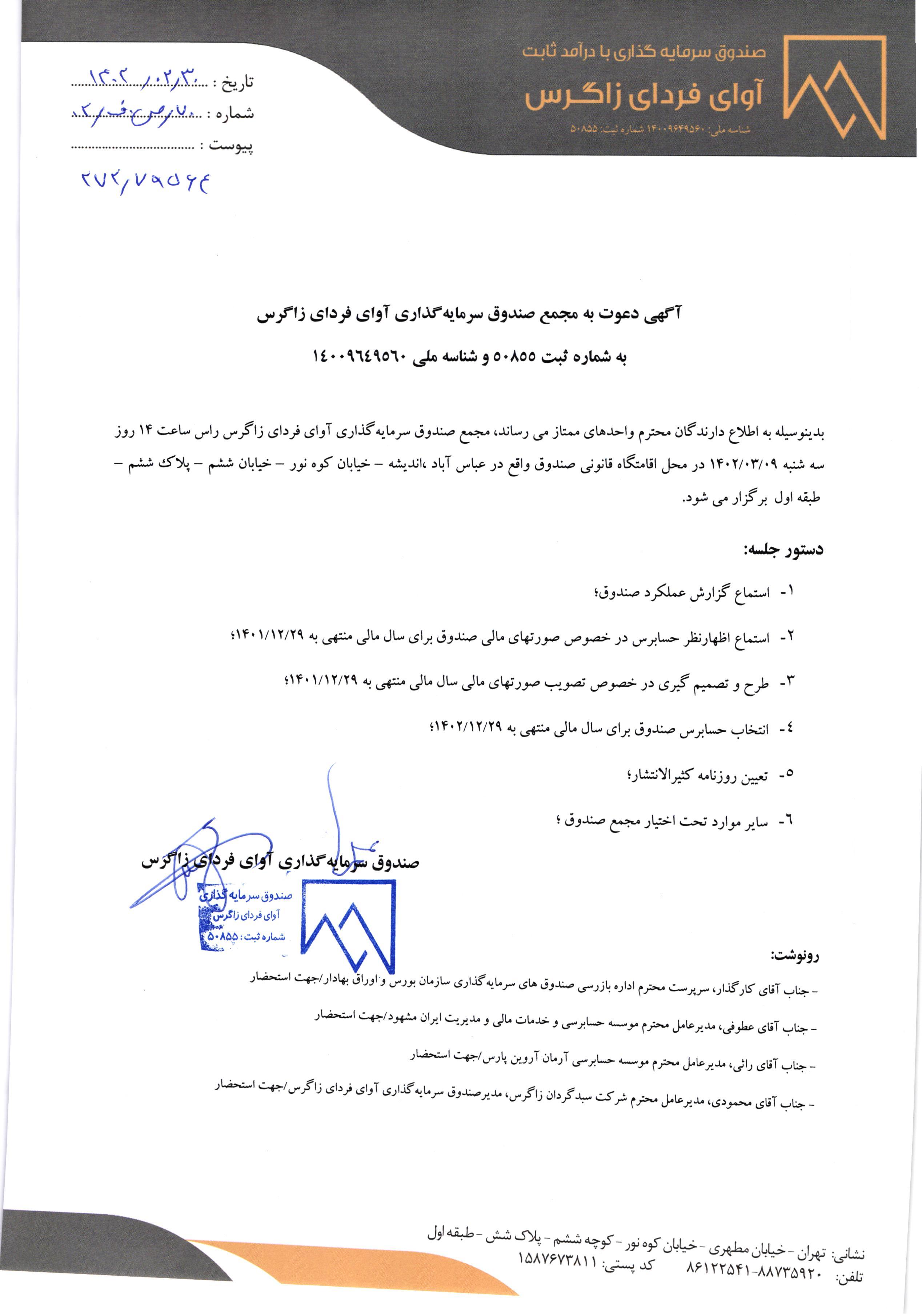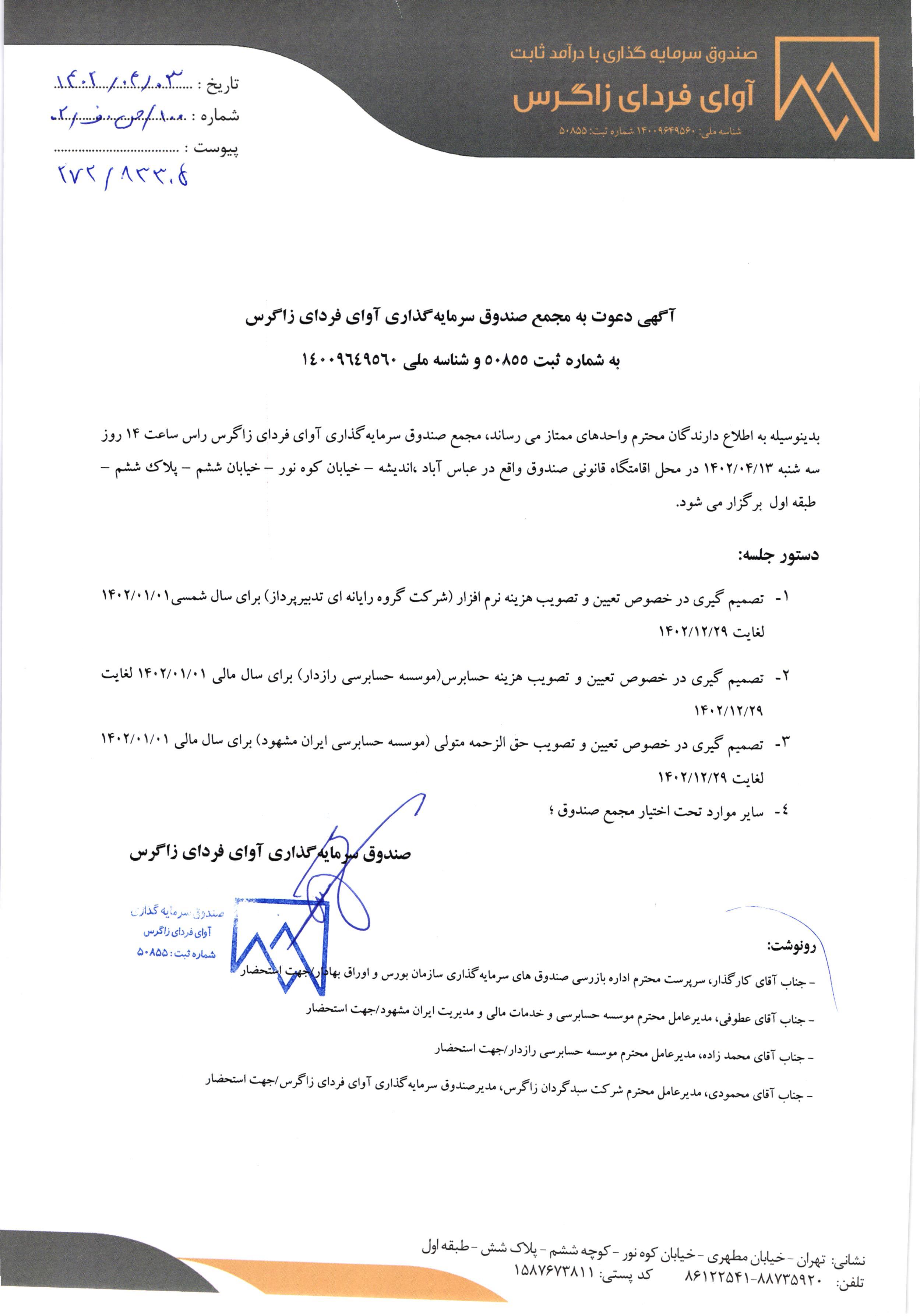 آگهي دعوت به مجمع صندوق آواي فرداي زاگرس مورخ ۱۴۰۱/۰۵/۰۹ساعت ۱۰:۰۰