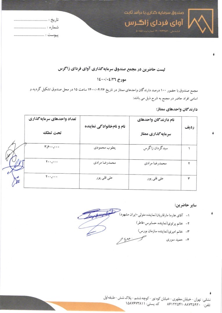 لیست اسامی حاضرین در مجمع صندوق آوای فردای زاگرس مورخ ۱۴۰۰/۱۰/۰۶