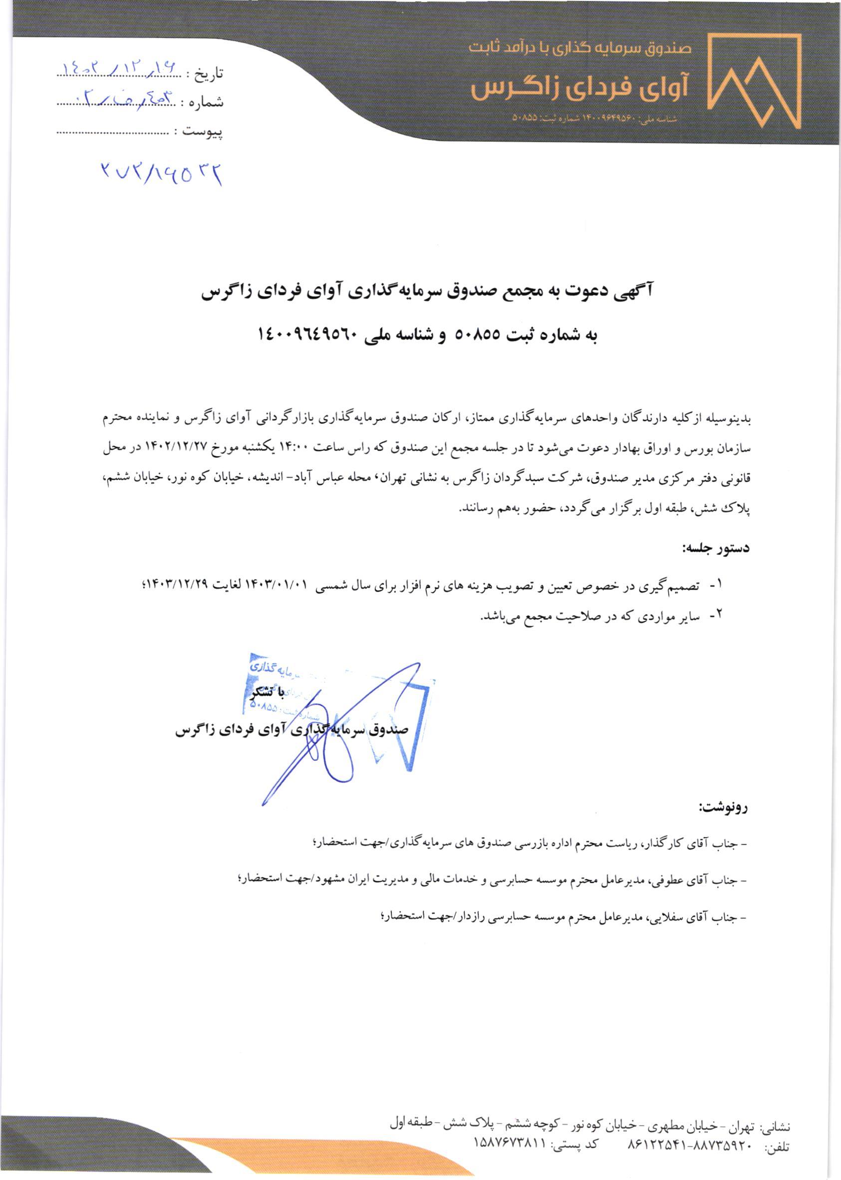 آگهی دعوت به مجمع صندوق آوای فردای زاگرس مورخ ۱۴۰۴/۰۶/۰۵ ساعت ۱۴:۰۰