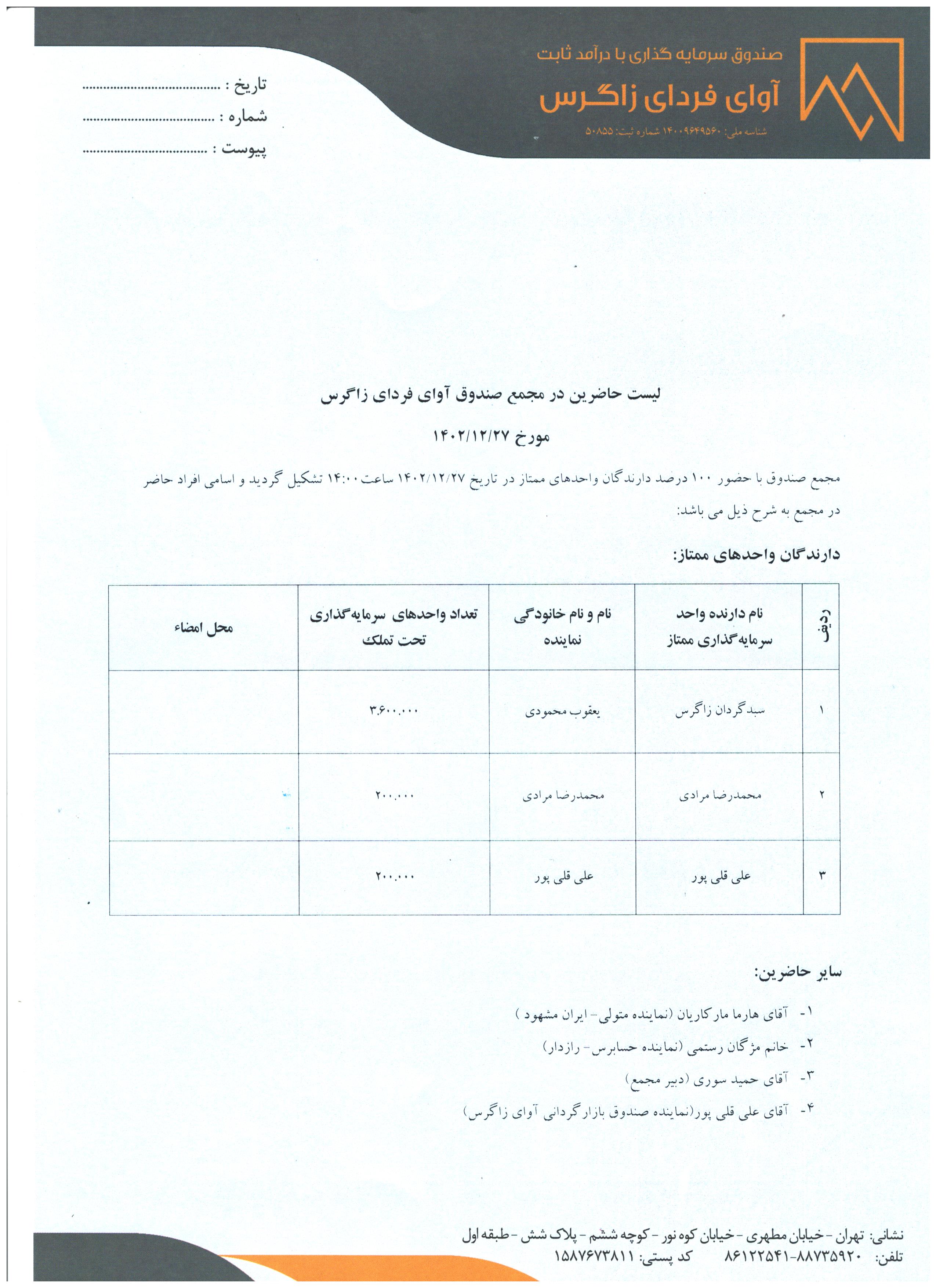لیست اسامی حاضرین در مجمع صندوق آوای فردای زاگرس مورخ ۱۴۰۰/۱۱/۱۶