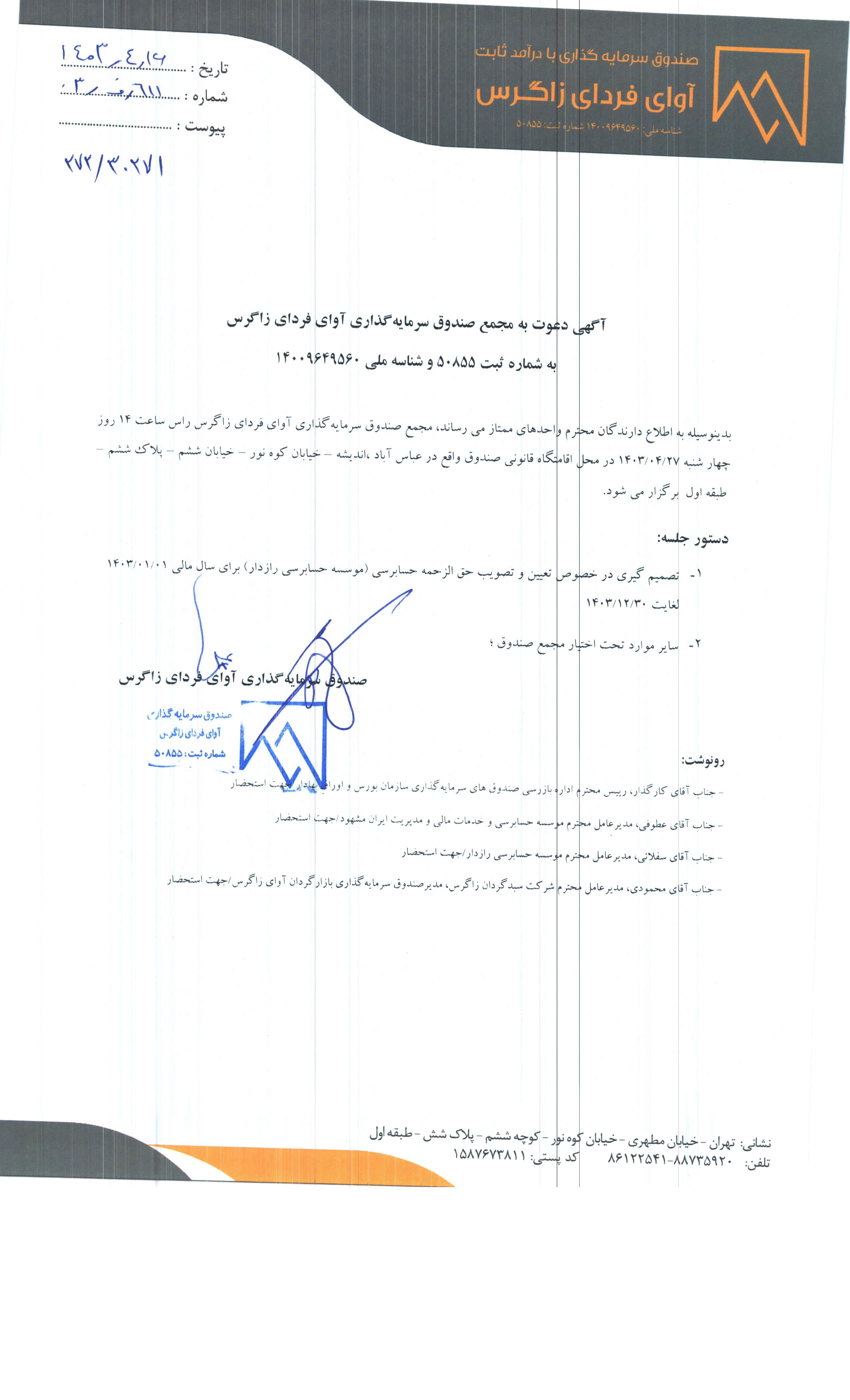 آگهی دعوت به مجمع صندوق آوای فردای زاگرس ۱۴۰۳/۰۴/۲۷- هزینه حسابرس